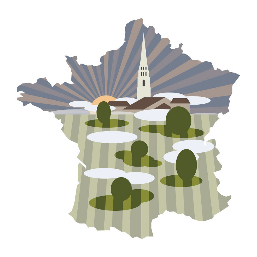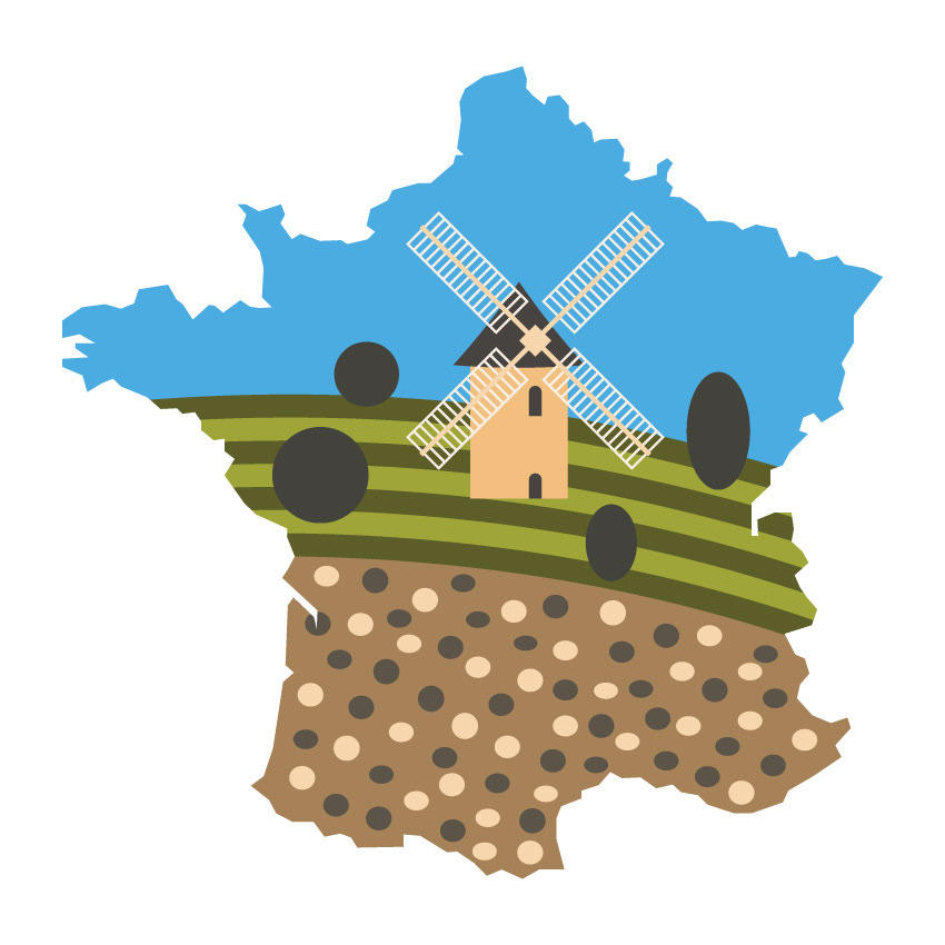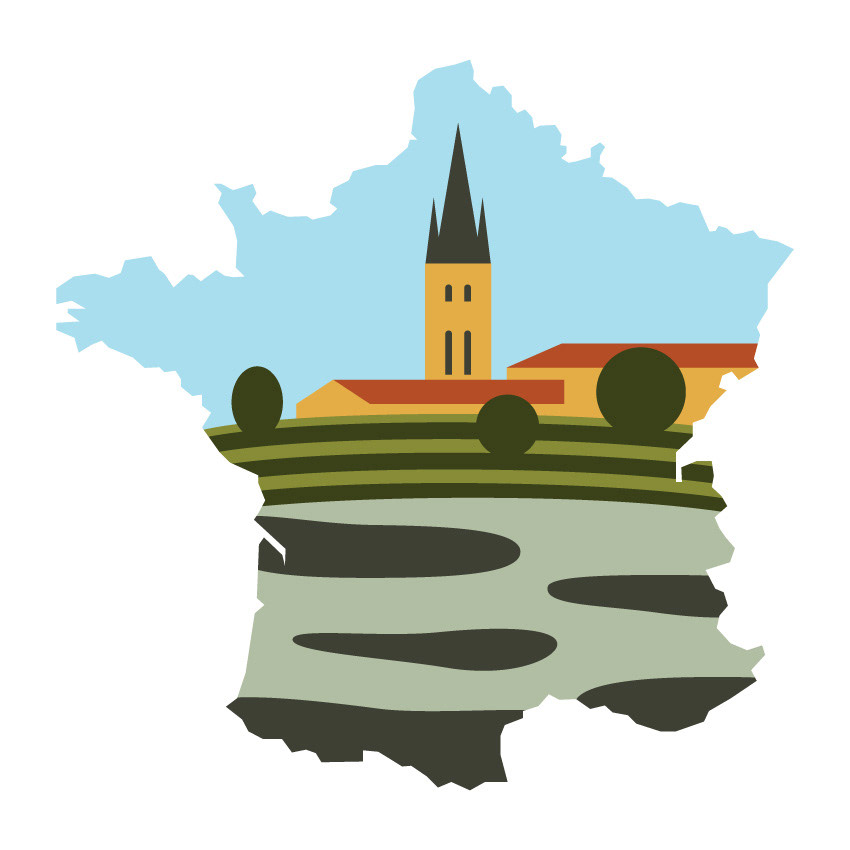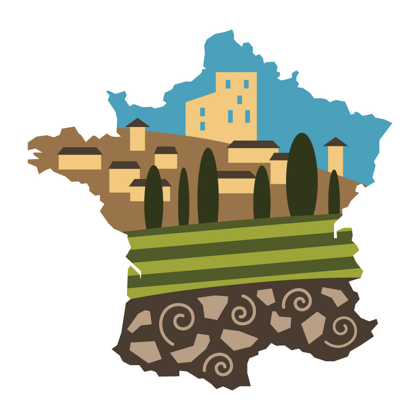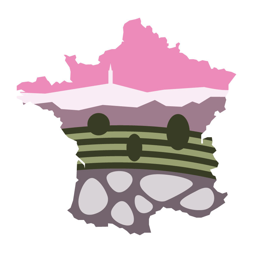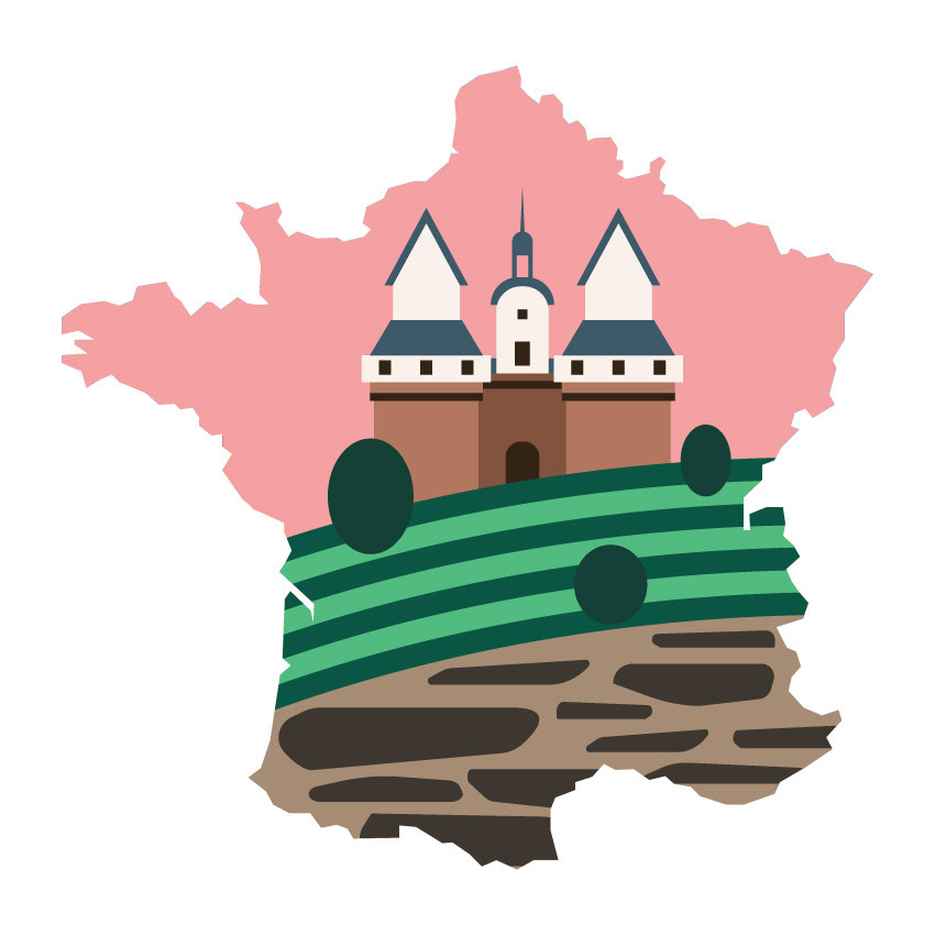 This illustration series explores French regions and their vineyards through simplified forms and symbolic visuals. Each piece is inspired by unique soil compositions of regional vineyards, combined with characteristic landscapes and historic architecture to express a distinct sense of place.