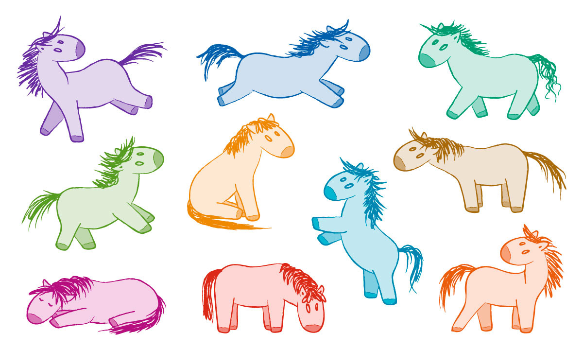 A playful collection of pony doodles created in a naive, childlike style, embracing simplicity and spontaneity with brigh colors and crayon-like strokes.